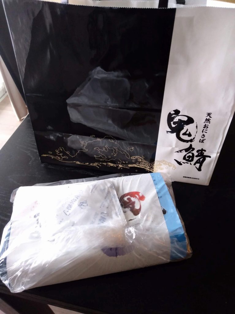 お声をかけると、五島のお店から職人さんがいらして、朝握ってくださったものが買えるようになっていました。今回は、切ってあるものを買ったので、円柱状ではなく寿司折ぽい箱です。