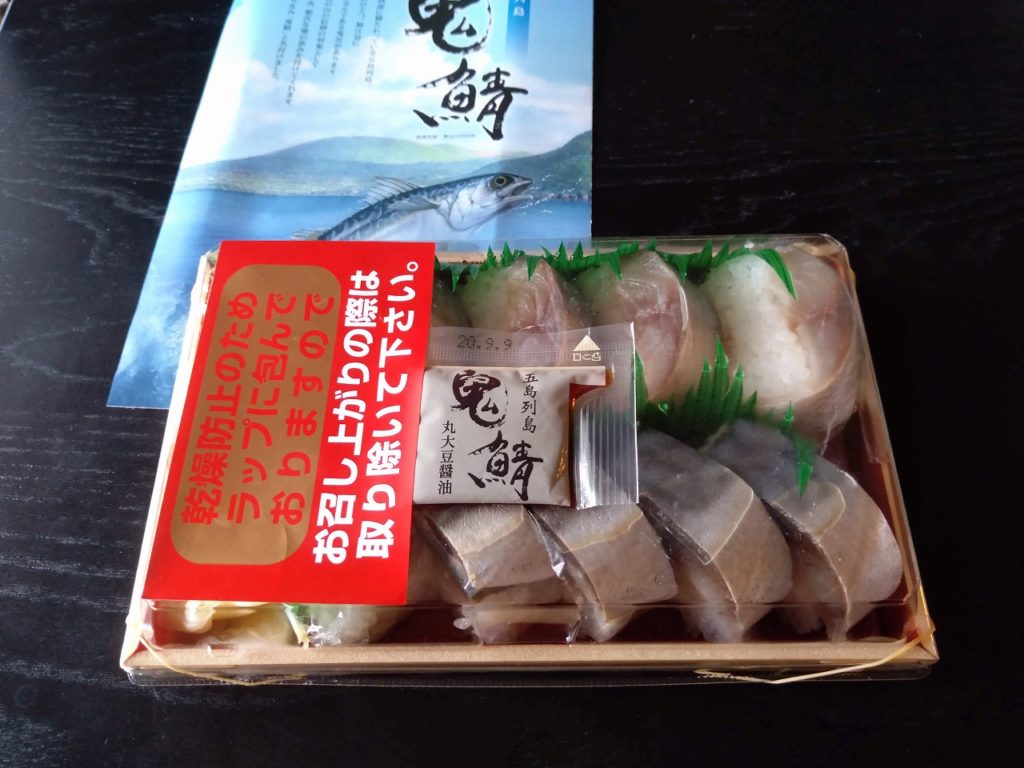 2年前、鬼鯖鮨と出合ったところから、お話ししましょう。五島列島で一番大きい島が、福江島というところで(行政区は五島市)、福江港と福江空港があります。情報収集をする中で、この福江港と福江空港と本店でしか買えない鯖鮨があるとのことで、興味を持ちました。