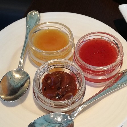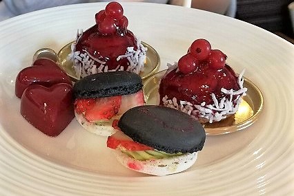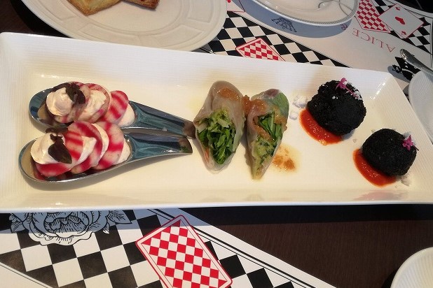 私が気に入ったのは1段目。うさ耳がついたトライフル(クリームブリュレのよう)に、トランプのハートをジャムで表現したバターサンド。