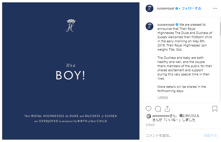 男の子の誕生は It’s a boy! 女の子の誕生はIt’s a girl! と決まった言い方があります。また、よく使うフレーズ「母子ともに健康」は、上のインスタグラムにも入っていて、Mother and baby are both healthy and well. 文中では、Mother の代わりに The Duchess 公爵夫人 としています。
