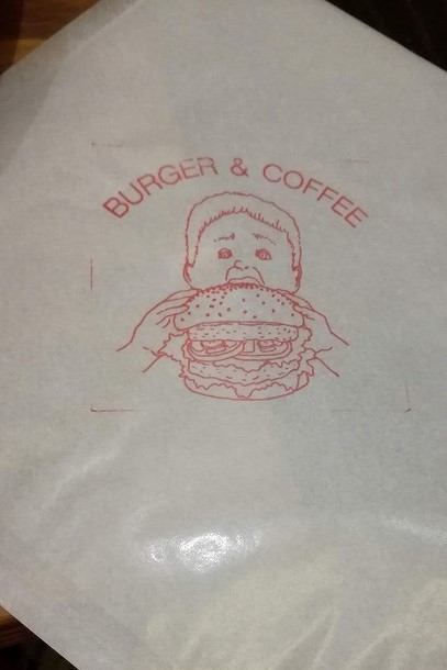 バーガーを包むラッピングにも、お店のロゴがスタンプされています。このままかじったら中身が飛び出る、シュールなイラスト。どうやら1号店は池尻大橋らしいですね(店内の会話による)。
