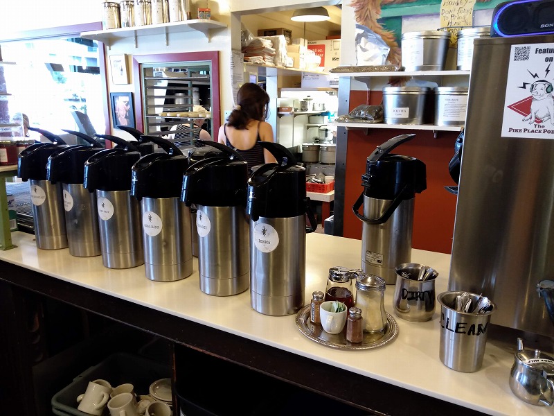 入ってすぐ、アメリカぽくないと分かったのは、紅茶のセレクション、ポットにずらっと並んでいます。もちろんコーヒーも頼めます。