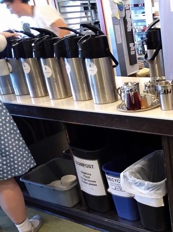 食べ終わった後は食器を戻しますが、ゴミも分別しています。「コンポスト(生ごみ)」「リサイクル(ビン・缶など)」「その他(燃えるゴミ)」。シアトルはどの店もそうでしたが、環境への配慮も好印象です。この写真に写りこんでいるお客さんの水玉スカートもかわいいし!