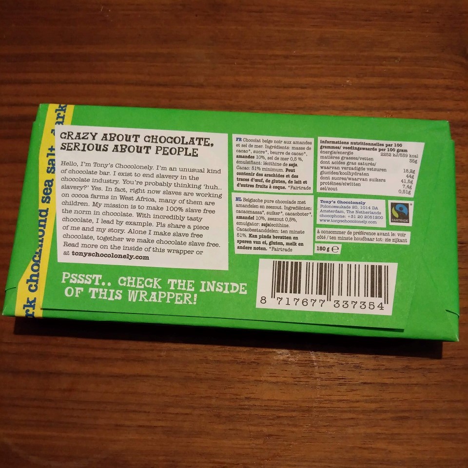 欧州出張のお土産をいただきました。「Tony’s Chocolonely」です。食したのは、日本でもブームが起きている「sea salt」ソルト味でした。