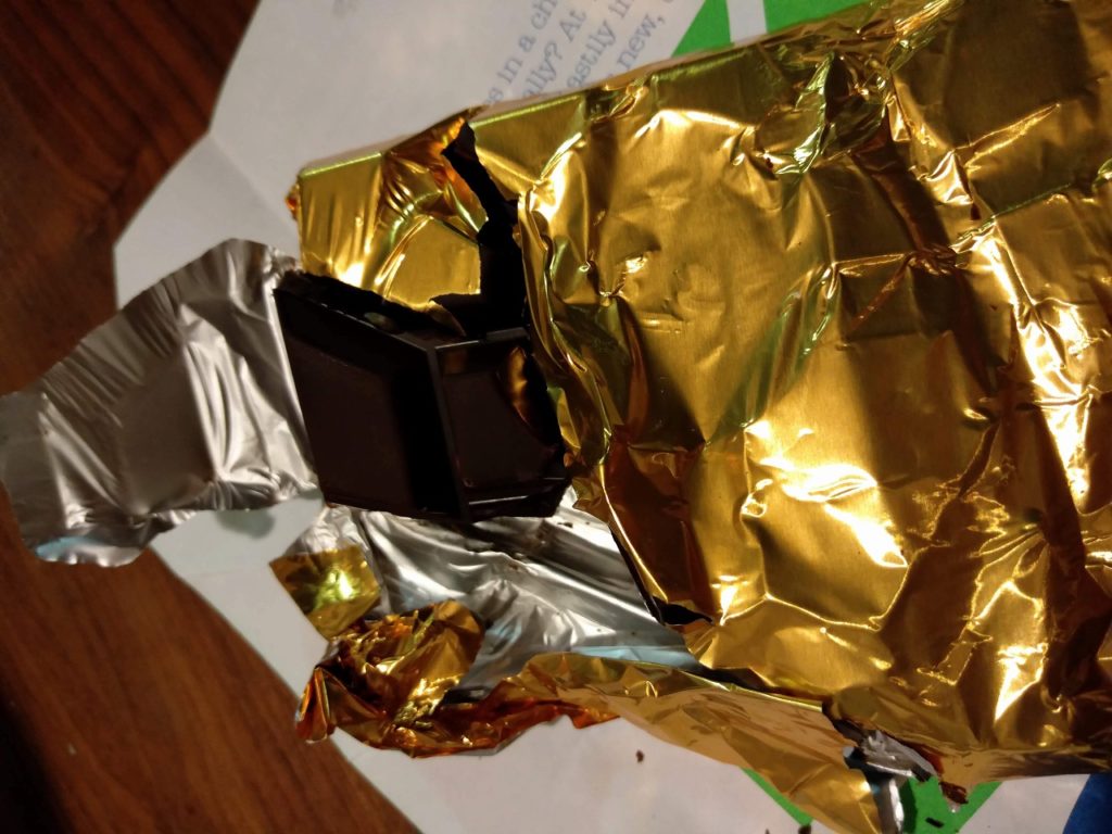 調べてみると、オランダのチョコレートでした。バーコード(EANコード)もオランダの番号、87とあります。例えるなら札束くらいがっしりしています。