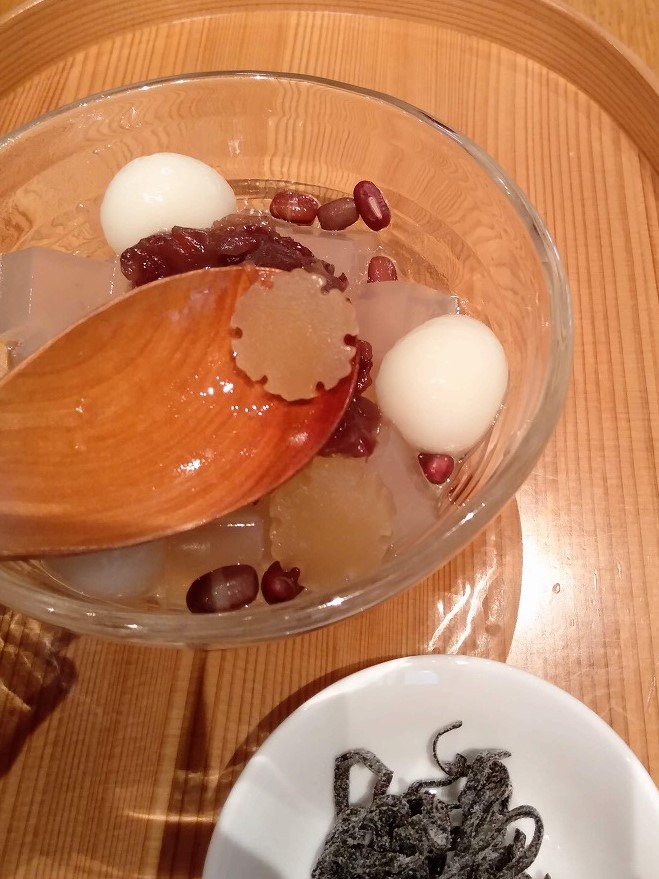 友人が頼んだあんみつには、とらや印にくり抜かれた羊羹が!そして塩昆布バンザイ!
