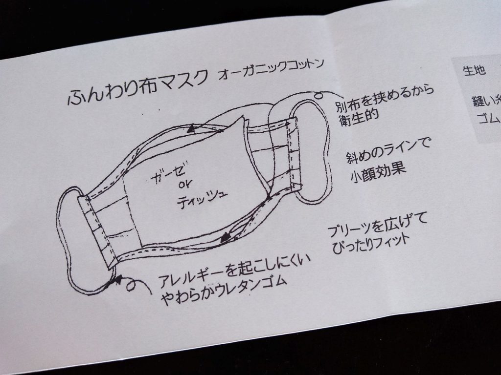 マスクを手作りしている余裕もなかったので、購入です。相場はいくらくらいでしょうかね、私が買ったものはオーガニックコットン製で1,000円(アピファス)。ちょうど2枚購入しておりました。