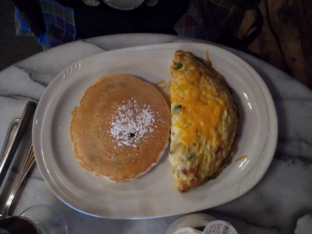 グリーンペッパー入りオムレツと、ブルーベリーパンケーキ(3枚入り)を頼み、ハーフ&ハーフにしました。写真は、オムレツを切り分ける前のサイズです。美味しくいただきました。
